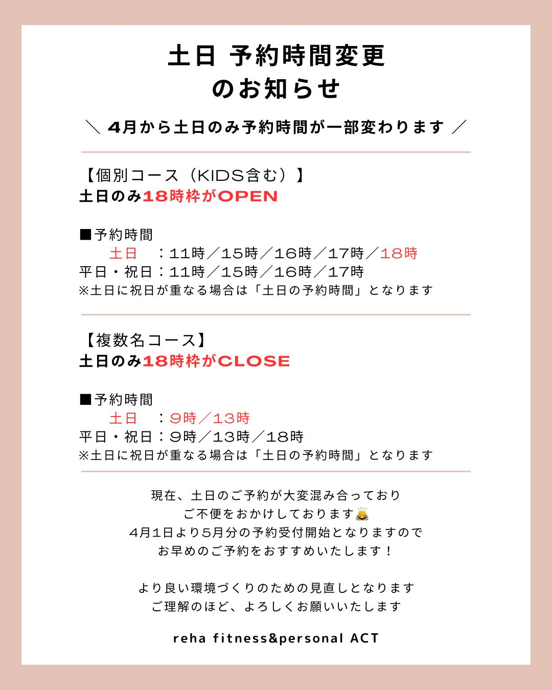 土日 予約時間変更のお知らせ お知らせ 2026.04.01 2026年4月〜 土日のみ予約時間を一部変更させていただきます。 土日のみ 複数名コース18時→個別コース18時 に変更となります。 現在土日のご予約が混み合っており、ご迷惑をおかけしております。 よりよい環境づくりのための変更となります。 ご理解のほどよろしくお願いいたします。 4月からもどうぞよろしくお願いいたします。